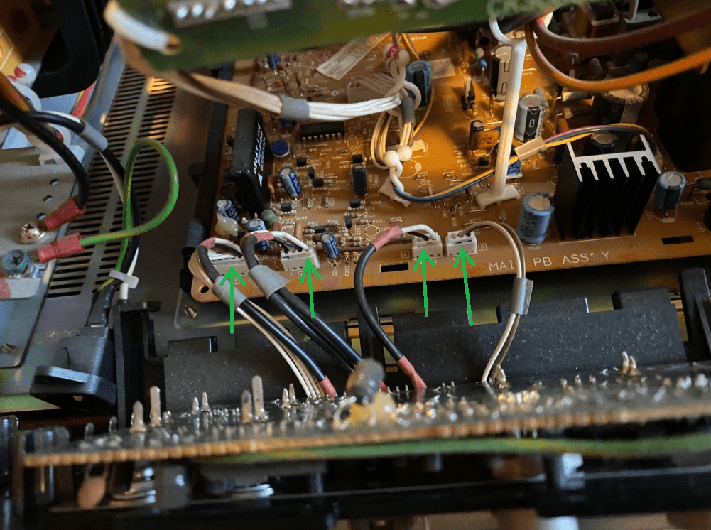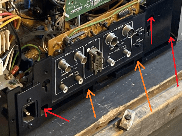 Once the screws are out, you’ll need to slightly pry up on two tabs located here, once those unlatch from the “MAIN PB” board, the rear panel should come free. These tabs located in the holes with the Orange arrows below.